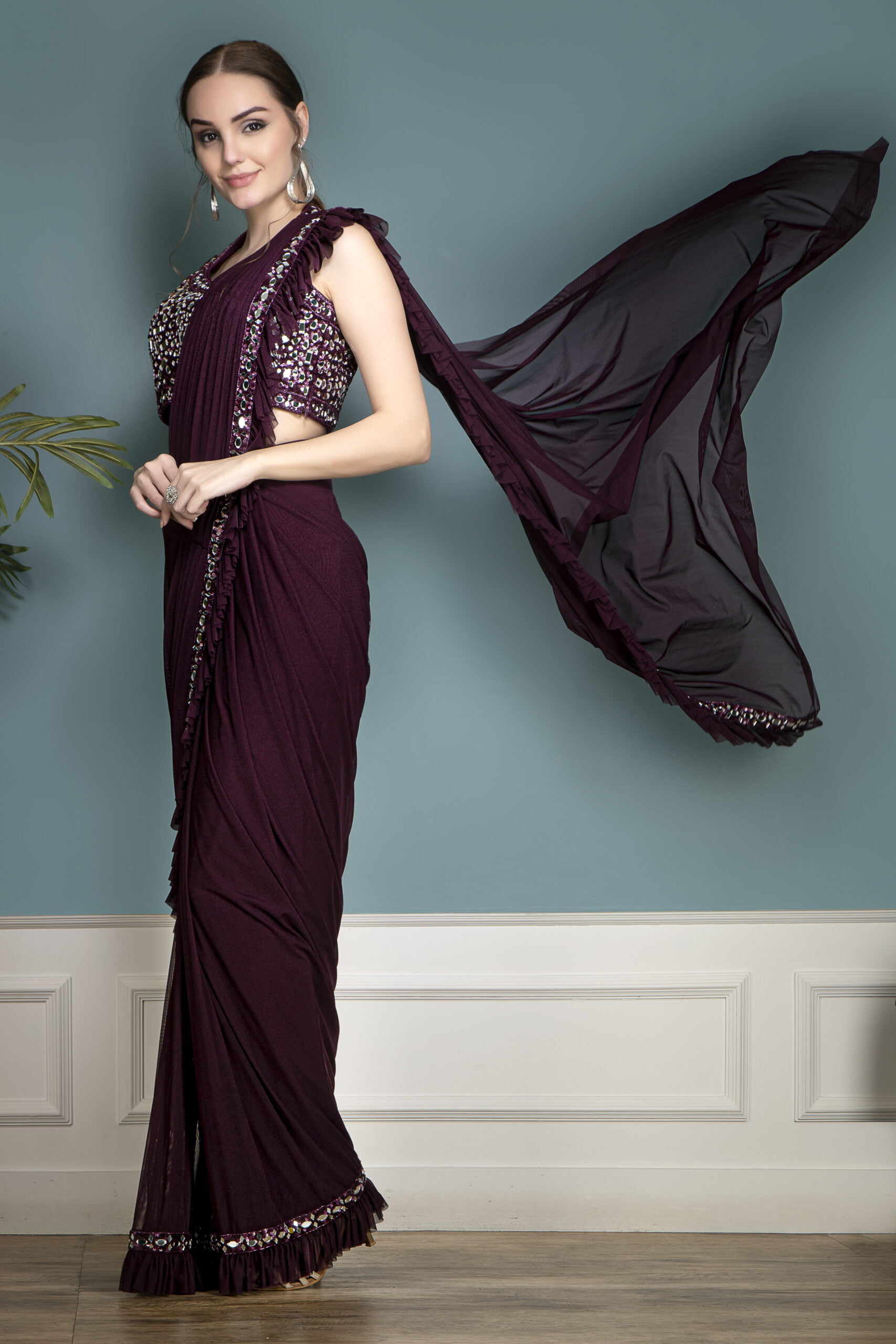 Wine Lycra Blend Saree